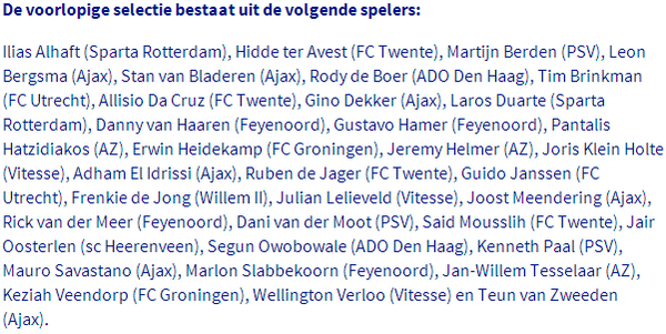 القائمة الأولية لمنتخب هولندا تحت 18 لمواجهة صربيا الودية. السيد ستيكلنبيرغ سيعلن عن القائمة النهائية في تاريخ 30